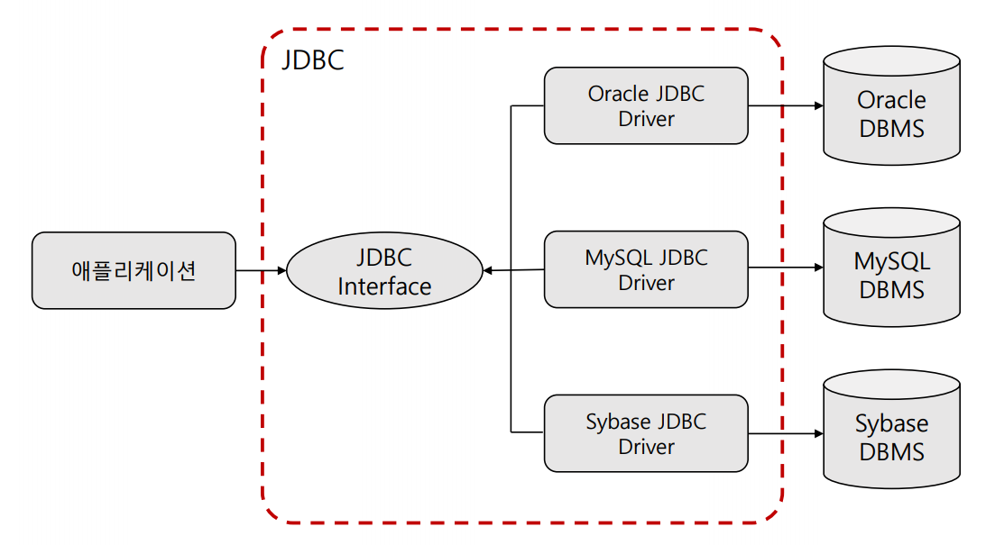 - 각 데이터베이스의 드라이버를 연결하여 데이터베이스와 자바를 연결해 주며, 해당 데이터베이스의 드라이버가 존재하여야 연결 가능하다.