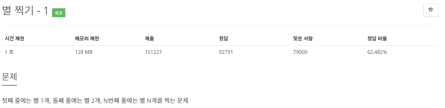 첫째 줄에는 별 1개, 둘째 줄에는 별 2개, N번째 줄에는 별 N개를 찍는 문제