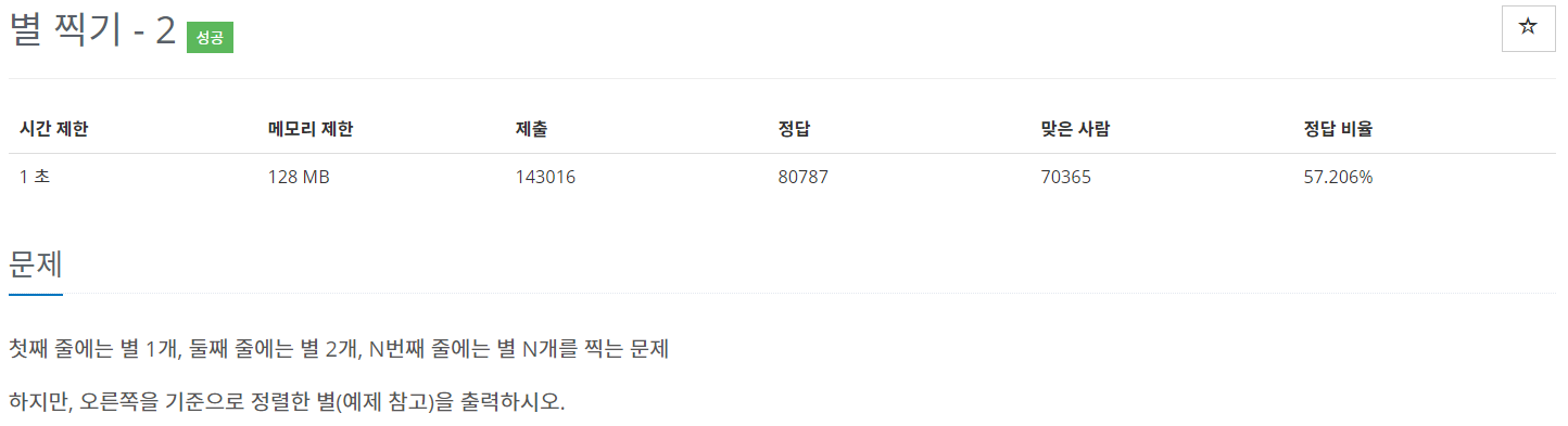 첫째 줄에는 별 1개, 둘째 줄에는 별 2개, N번째 줄에는 별 N개를 찍는 문제 하지만, 오른쪽을 기준으로 정렬한 별(예제 참고)을 출력하시오.