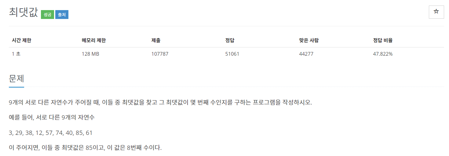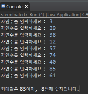 9개의 서로 다른 자연수가 주어질 때, 이들 중 최댓값을 찾고 그 최댓값이 몇 번째 수인지를 구하는 프로그램을 작성하시오. 예를 들어, 서로 다른 9개의 자연수 3, 29, 38, 12, 57, 74, 40, 85, 61 이 주어