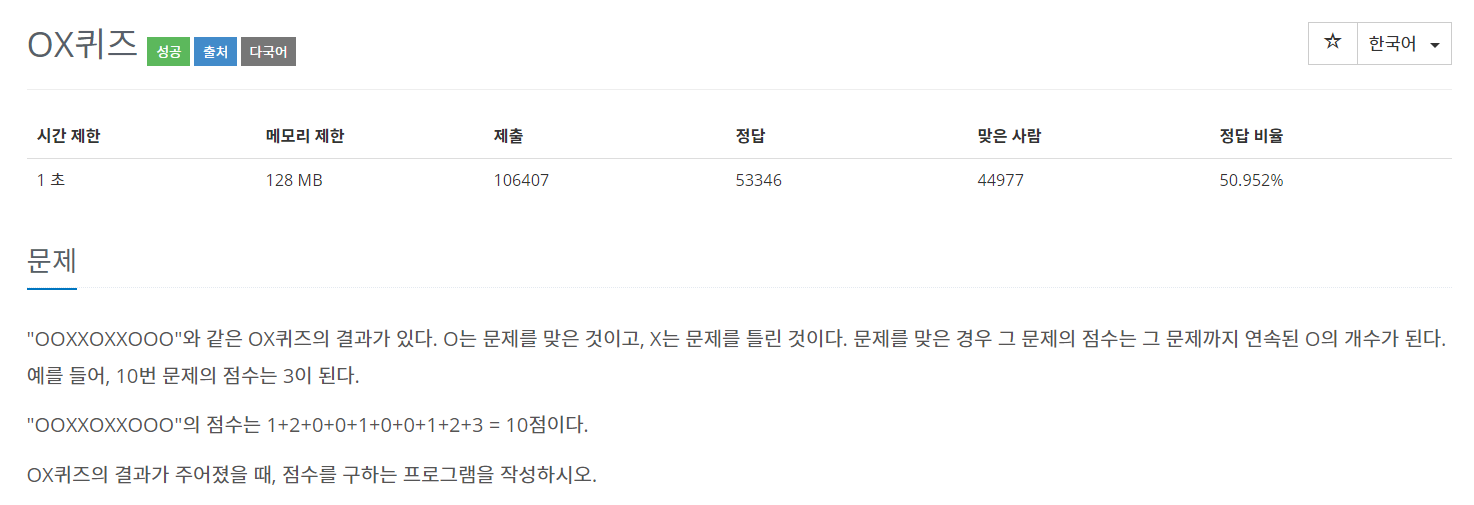 "OOXXOXXOOO"와 같은 OX퀴즈의 결과가 있다. O는 문제를 맞은 것이고, X는 문제를 틀린 것이다. 문제를 맞은 경우 그 문제의 점수는 그 문제까지 연속된 O의 개수가 된다. 예를 들어, 10번 문제의 점수
