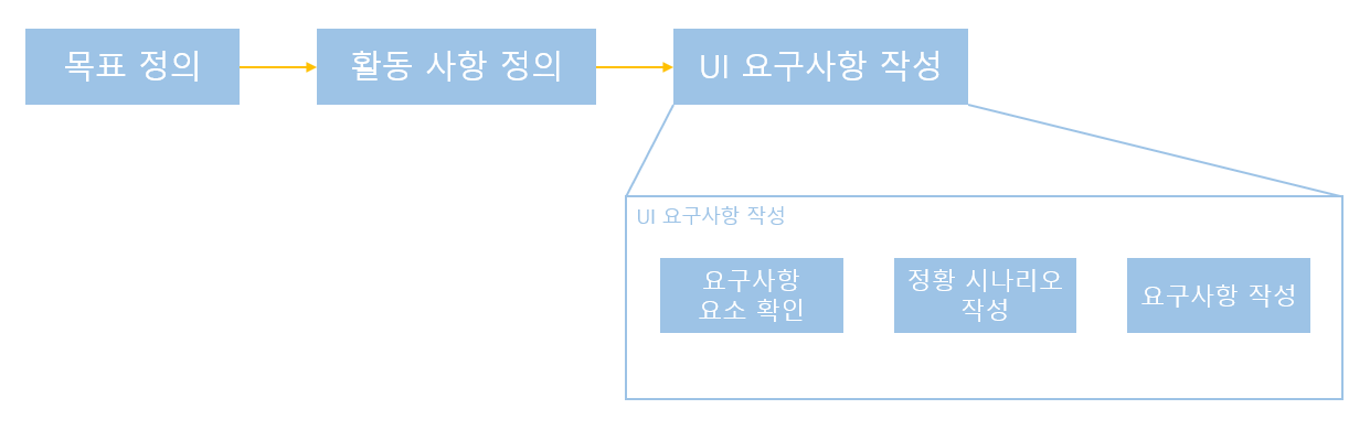 - UI 요구사항 작성 : 수집된 요구사항을 검토하고, 분석하여 UI 개발 목적에 맞게 작성하는 단계이다. UI 요구사항 작성은 다음과 같은 3단계로 진행된다.