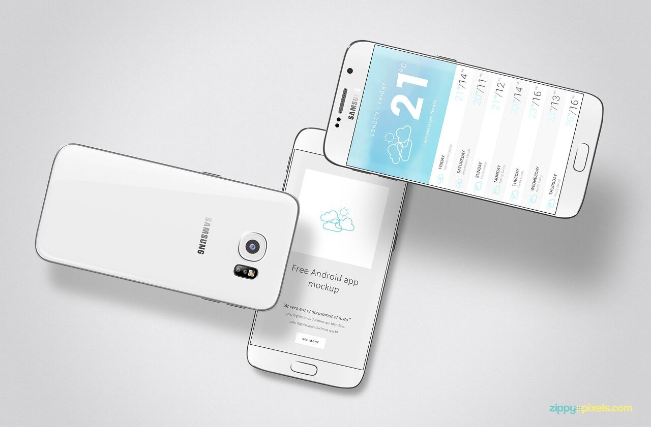 목업 (출처: https://zippypixels.com/product/mockups/devices/free-android-app-mockup/) - 스토리보드 : 와이어 프레임에 콘텐츠에 대한 설명이나 페이지간 이동 흐름 등을 추가한 문서이다. 디자이너와 개발자가 최종적으로 찾고하는 작업 지침서로 서비스 구축을 위한 모든 정보가 들어 있어야 한다.