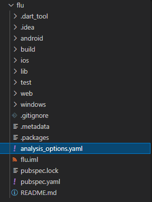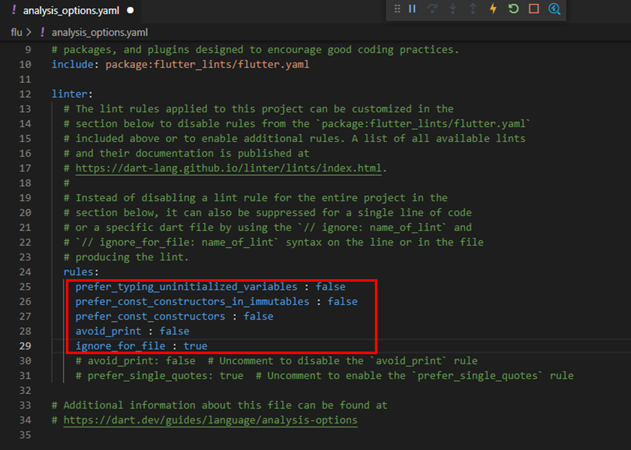 Lint 경고가 발생하지 않도록 하기 위해서는 analysis_options.yaml 파일을 수정하여야 합니다.