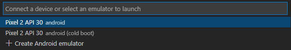 Flutter: Launch Emulator를 선택하면 에뮬레이터를 선택하거나 생성할 수 있습니다.
