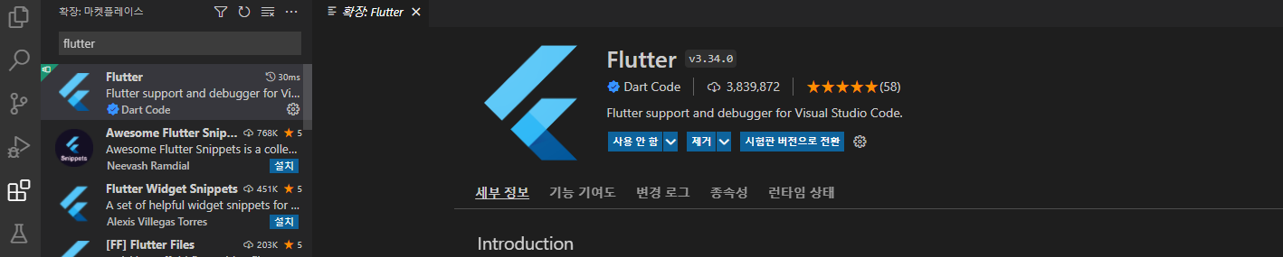 Flutter 플러그인을 설치하기 위해 마켓 플레이스에서 Flutter를 검색합니다.