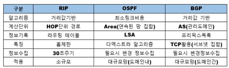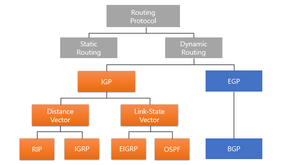 - Interior Gateway Protocol : AS 내에서의 라우팅을 담당하는 라우팅 프로토콜
