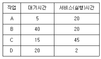 HRN 방식의 우선 순위 산정 공식 : (대기 시간 + 서비스 시간) / 서비스 시간