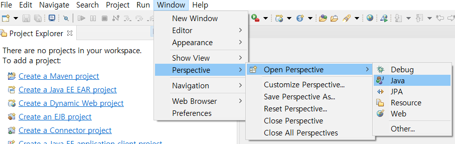 두 번째로 Window → Perspective → Open Perspictive → Java 메뉴를 선택하면 실행 가능합니다.