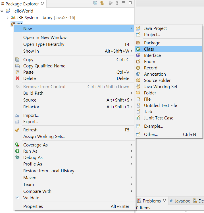 Package Explorer 뷰를 보면 생성된 프로젝트가 보이는데, 해당 프로젝트 내 src 폴더를 우클릭하여 소스 파일을 생성할 수 있습니다.