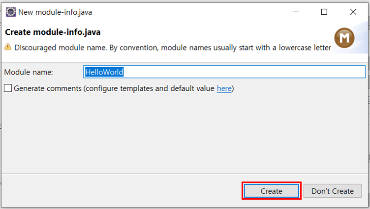 JDK 9 이상에서는 module-info.java를 생성하여 모듈화가 가능합니다. 따라서 다음과 같이 모듈화를 할 것인지를 묻는 창이 뜨게 된는데, 하지 않는 경우 Don't Create를 클릭합니다.