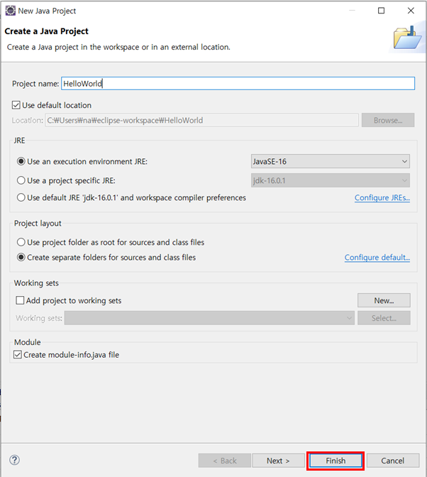 프로젝트는 워크스페이스 하위 디렉토리에 생성되는 것이 기본이며, 변경이 필요한 경우 'Use default location'의 체크를 해제한 후 Browse 버튼을 눌러 변경 가능합니다.