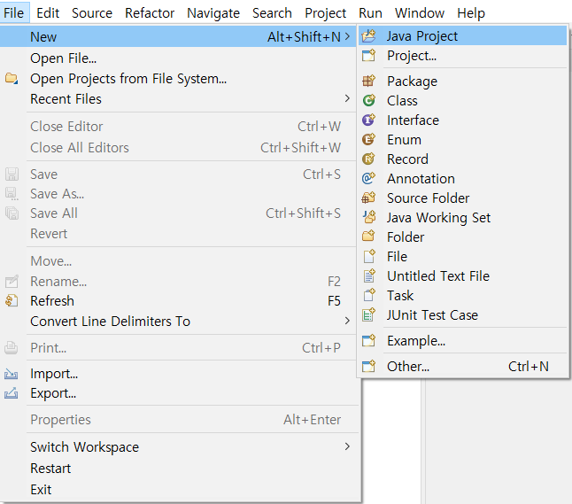 Java 퍼스펙티브를 실행하였다면 File → New → Java Project 메뉴를 클릭하여 새 프로젝트를 생성합니다.