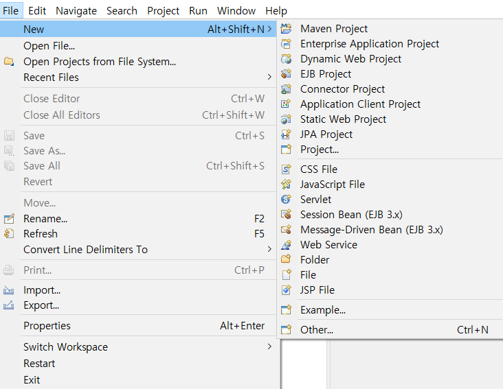 Java EE 퍼스펙티브에서 File → New 메뉴를 확인하면 Java Project 생성이 보이지 않는 것을 알 수 있습니다.