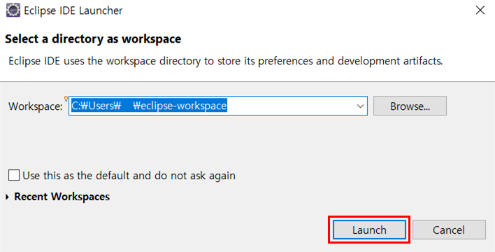 Workspace 설정이 완료되었다면 Launch 버튼을 눌러 이클립스를 실행합니다.