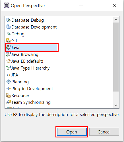 퍼스펙티브 아이콘을 클릭하면 다음과 같은 창이 뜨는데, Java를 선택 후 Open을 누르면 Java 퍼스펙티브를 실행할 수 있습니다.