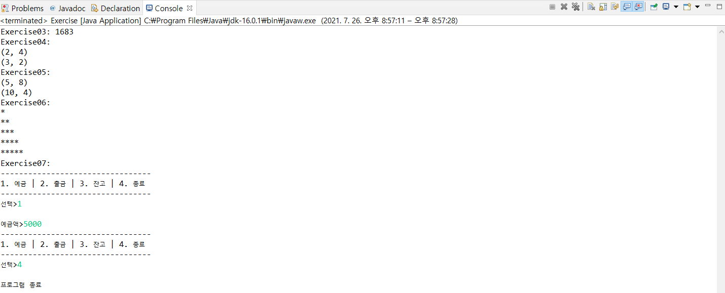 Exercise 07은 while문을 이용해 입금, 출금, 조회 프로그램을 작성하는 문제입니다.