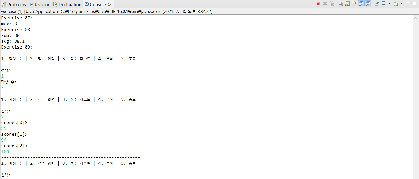 Exercise 09는 학생 수와 학생의 점수를 직접 입력받아 최고 점수와 평균 점수를 출력하는 프로그램을 만드는 문제입니다.