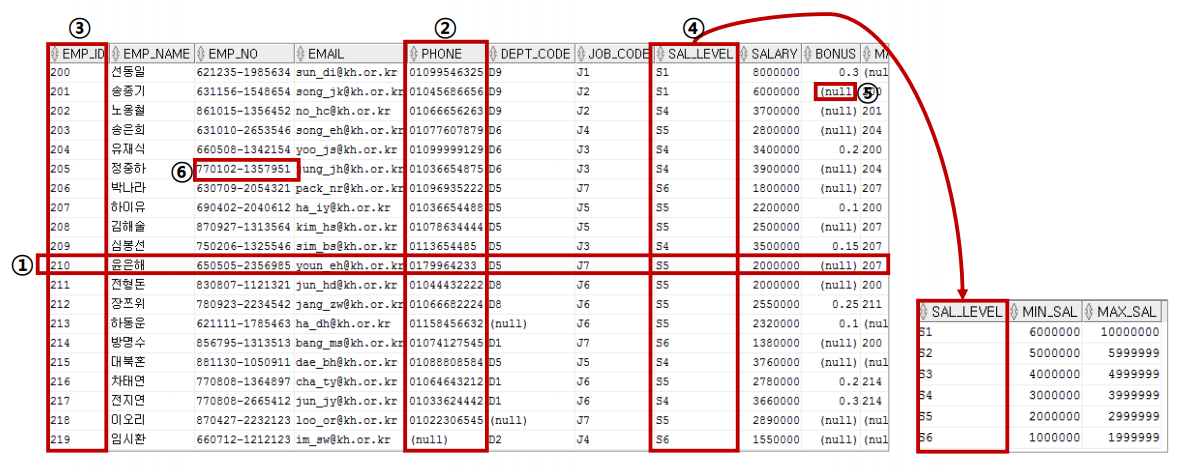 ⑥ 컬럼값, 속성값, 칸 하나하나의 값을 의미한다.