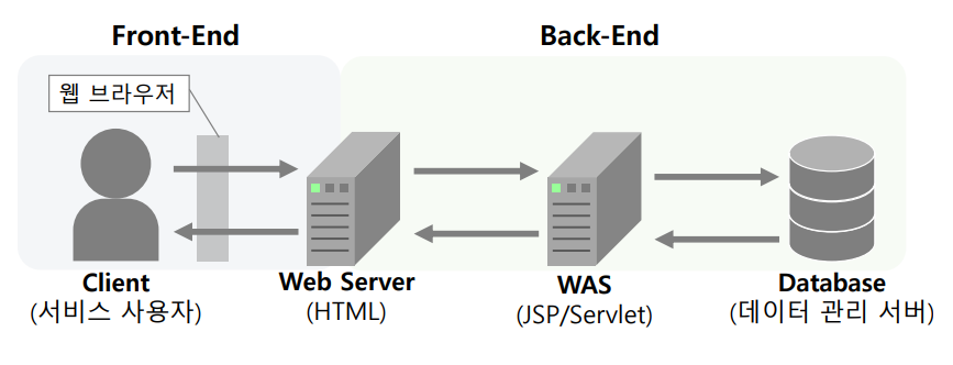 - JSP 컨테이너(JSP-Container): JSP 파일을 다시 java 코드로 변경해주고 class 파일로 전환하여 메모리 공간에 로드한 뒤 실행 가능하게 만드는 작업(Servlet화)을 진행한다. 처리 결과를 HTML 파일로 만들어 주는 작업을 진행한다. 동적 로딩 처리를 진행한다.